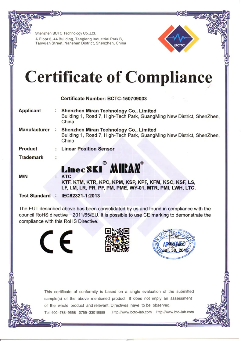 直线位移传感器/电阻尺CE证书
