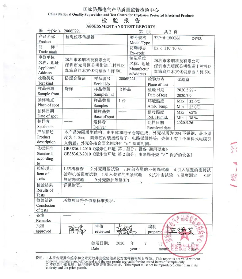 防水防爆型拉绳位移传感器检验报告