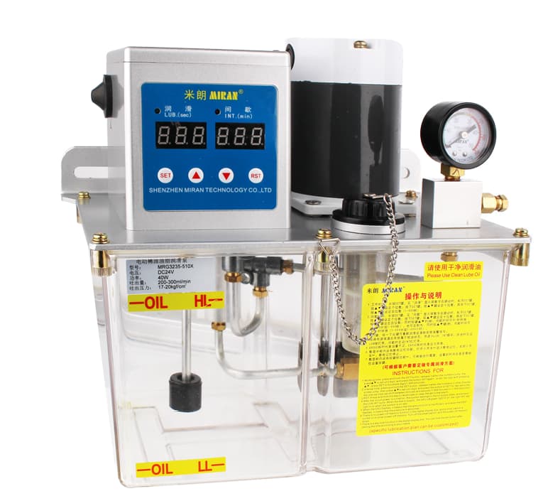 全自动稀油油脂一体泵特点:流量200-300ml/min,额定注油压力20-35Kgf/cm,操作方式微电脑,电机电压DC24V,电机功率40W,润滑油粘度范围30#~00#,油箱容积5L,出油口管道Φ6mm,适用系统抵抗式/容积式。