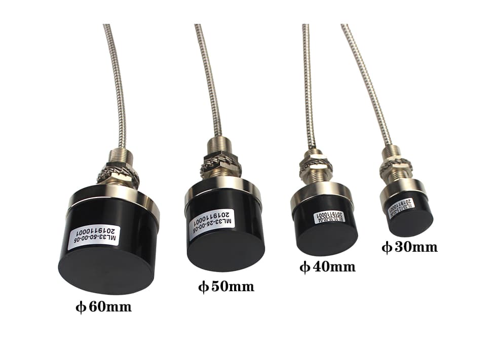 在制作过程中,探头头部体一般采用耐高温PPS工程塑料,通过“二次注塑”成型将线圈密封其中。使探头在恶劣的环境中能可靠工作。由于头部体线圈直径决定传感器系统的线性量程,因此我们通常用头部体外部直径来分类和表征各型号探头,一般情况下传感器系统的线性量程大致是探头头部直径的1/2~1/4倍。ML33系列传感器探头见图所示(标准型):