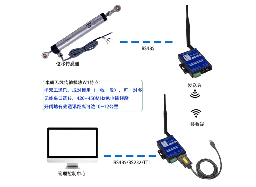 产品名称:无线传输模块与直线位移传感器所远程连接