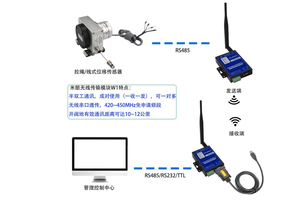 产品名称:无线传输模块与拉线位移传感器所远程连接