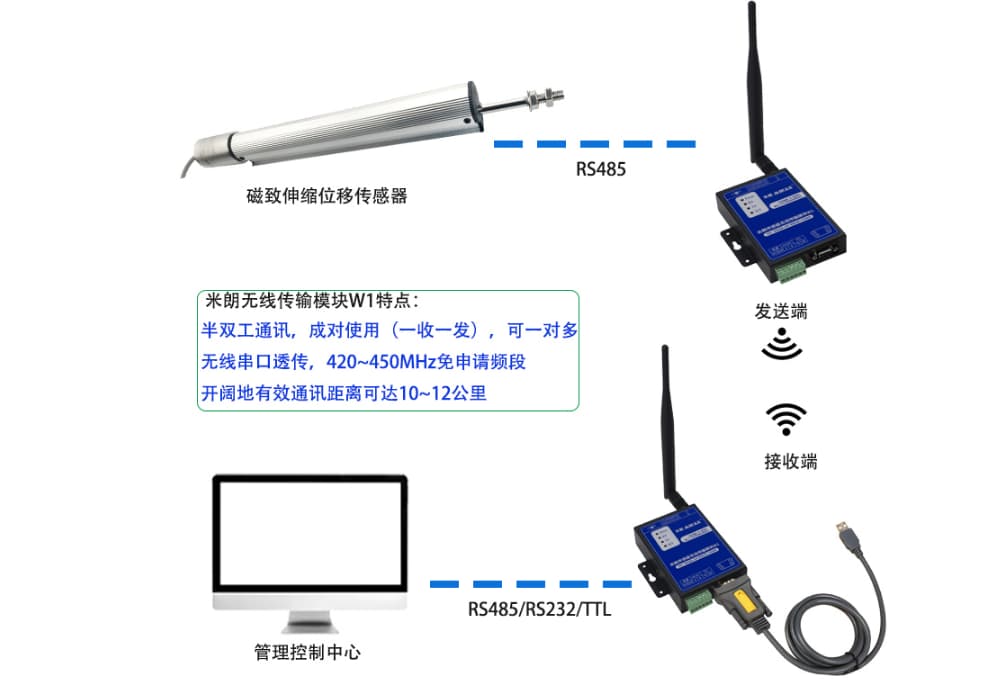 产品名称:无线传输模块与磁致伸缩位移传感器所远程连接