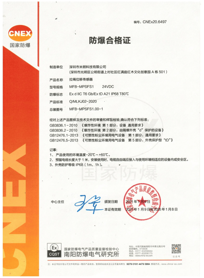 MFB-MPSFS1拉绳位移传感器防水防爆(隔爆型)适用于以下位移传感器:MFB-MPSFS1-S-EX、MFB-MPSFS1-M-EX、MFB-MPSFS1-L-EX、MFB-MPSFS1-XL-EX,其中信号输出方式有:电位器(0-5K 或者0-10K)、0-5V、0-10V、4-20MA、RS485 数字信号。