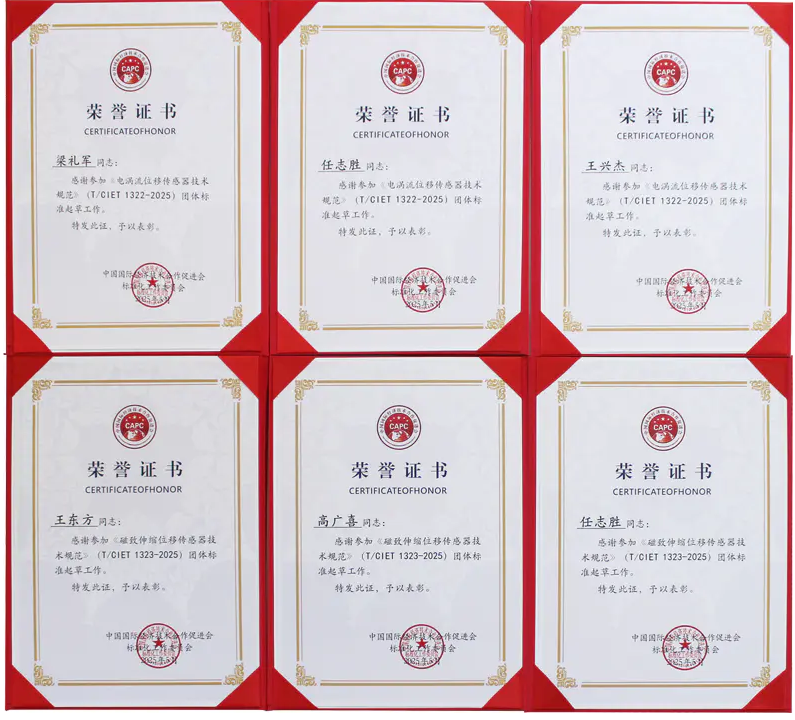 米朗科技MIRAN《股票代码874771》---电涡流位移传感器和磁致伸缩位移传感器标准起草单位荣誉证书2025年