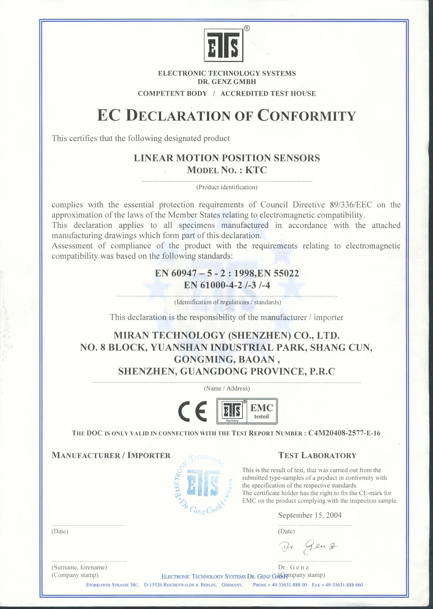 KTC直线位移传感器CE认证证书