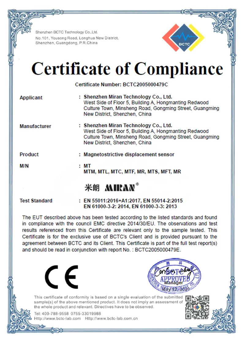 KTF直线位移传感器CE认证证书