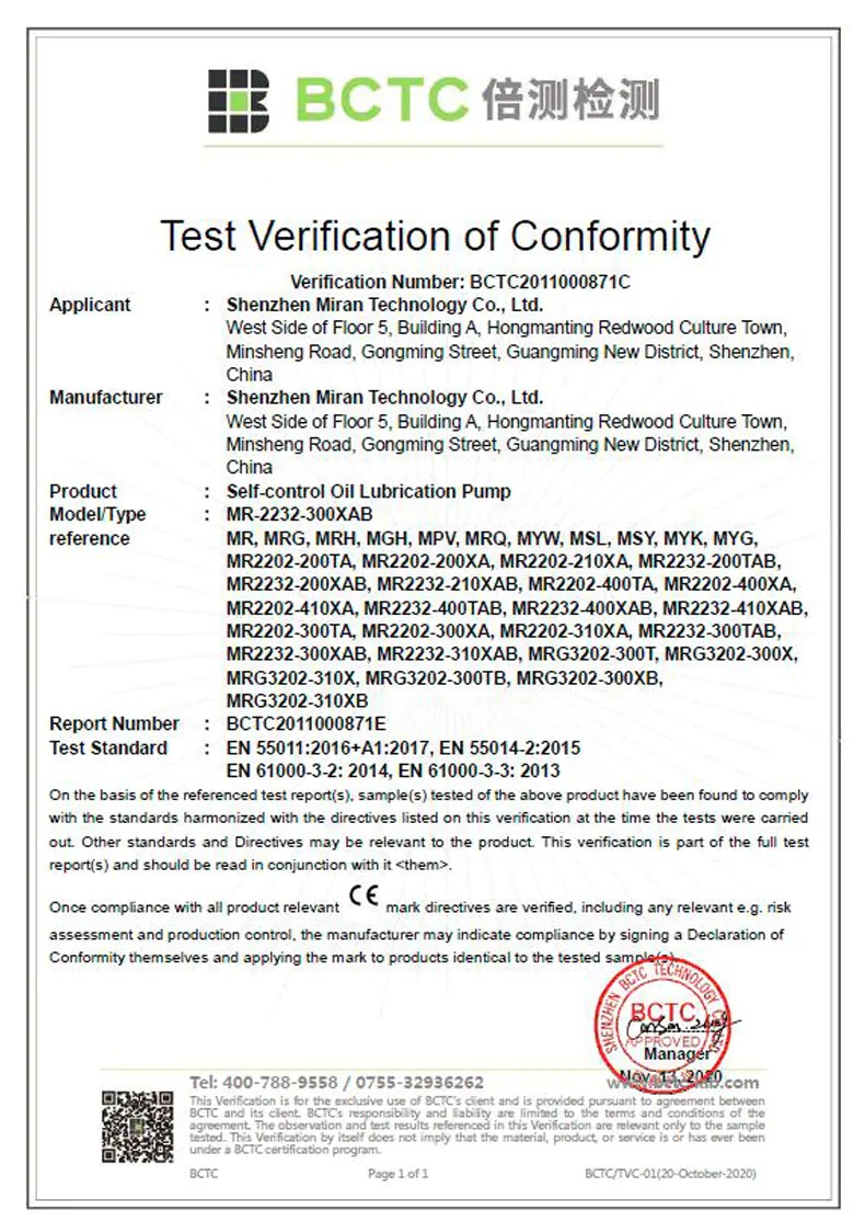 润滑油泵CE证书