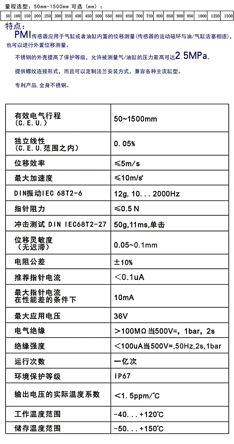 PMI磁阻式位移传感器技术参数: