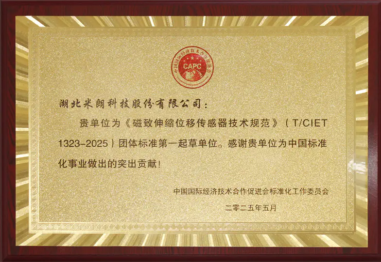 米朗科技MIRAN《股票代码874771》---电涡流位移传感器和磁致伸缩位移传感器标准起草单位荣誉证书2025年